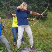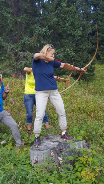 In der Ankündigung zur Turnfahrt wurde uns mitgeteilt, dass wir Taschengeld in Euro mitnehmen sollten – das kann doch nur heissen, dass wir am Montag zum Shoppen gehen… weit gefehlt. Mit Pfeil und Bogen erlegten wir unsere Mahlzeiten im Wald und in der Wiese. Jeder Treffer wurde von den beiden Teams gezählt, damit am Ende des Tages auch eine Amazone zur Jagdgöttin ernannt werden konnte.