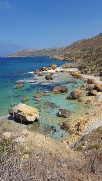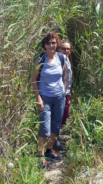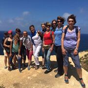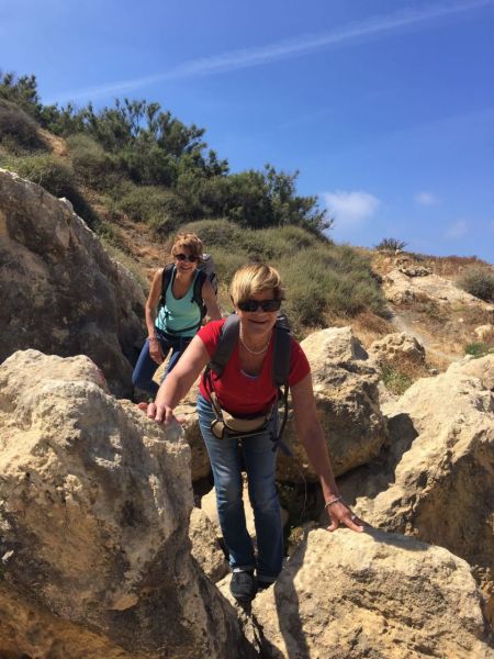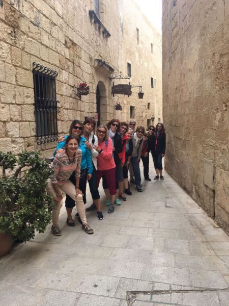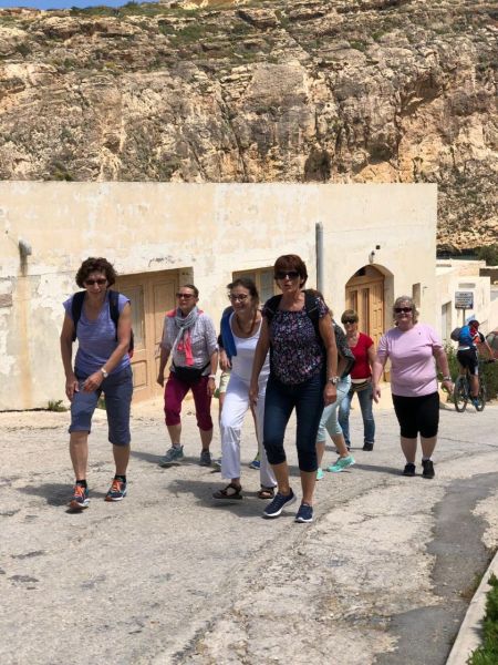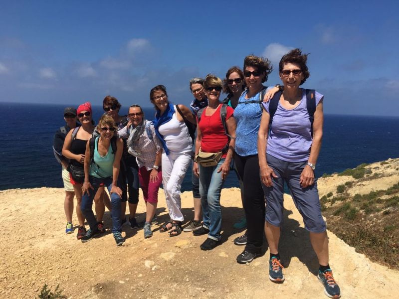 Heute mussten wir früh aufstehen, bereits um 8 Uhr verliessen wir die Villa. Rita und unser Fahrer brachten uns zur Fähre nach Gozo, der Schwesterinsel von Malta. Am Hafen von Mgarr wartete unser nächster Kleinbus der uns nach Victoria, dem Hauptort der Insel, fuhr. Rita brachte uns während der Busfahrten nicht nur die Landschaft näher, sondern auch Rezepte gesunder Gerichte mit „Haschiisch“ (Gemüse) und lehrte uns natürlich einige Worte Maltesisch, wie bonjo, bonsera, grazii, cisk (Bier) und das Nationalgetränk Kinni (ohne Alkohol und sehr erfrischend). In Victoria angekommen, konnten Interessierte die von Römern erbaute „Citadella“ besichtigen oder shoppen gehen. Aber alle hatten sicher einen Espresso, der wunderbar schmeckte – übrigens in jedem Maltesischen Restaurant oder Kaffee. Danach fuhren wir wieder weiter, entlang der zerklüfteten Küste, vorbei an trockenen Feldern und Salzwannen im Meer. Bei Zwischenstopps lernten wir diverse Kräuter kennen, vor allem Kapern mit ihren sensationell schönen Blüten. In Masalforn Bay angekommen, durften wir uns über ein feines Mittagessen freuen. Der Hit war Fischcarpaccio, mit diversen frischen Fischen, Pulpo, Crevetten und Calamari. Nach dem Essen fuhren Bea und Erika mit Rita mit dem Bus weiter zu dem Ggantija Tempel. Die anderen elf Frauen wagten sich frisch gestärkt auf den Wanderweg der Küste entlang nach Ramla Bay. Diese Wanderung wird uns noch lange in Erinnerung bleiben. Der Wanderweg war wunderschön und sehr abwechslungsreich, mal steinig, sandig, steil, rutschig, im Grünen – aber immer mit einer grandiosen Aussicht über steile Küsten und das Meer; Schwindelfreiheit war von Vorteil. Wir kamen mit etwas Verspätung an unserem Ziel an und mussten uns recht sputen, um die nächste Fähre zu erreichen, die uns wieder nach Malta brachte. An diesem Abend genossen wir unsere Villa in vollen Zügen. Gesellschaftsspiele, Pizza, Billard spielen ………………