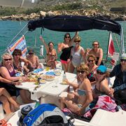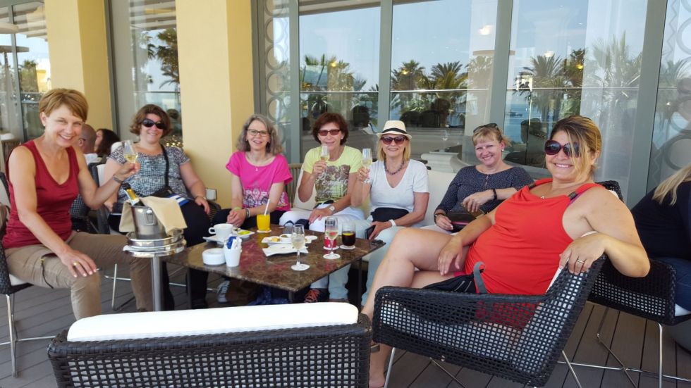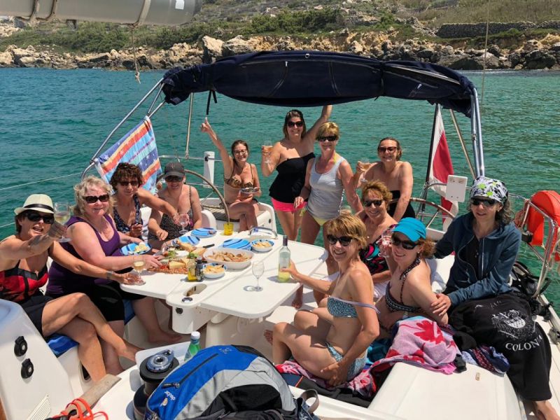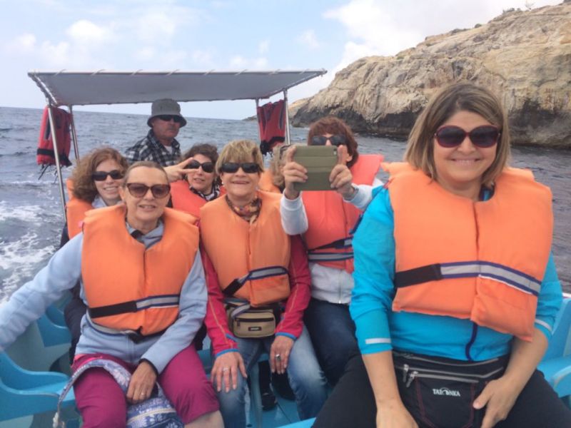 In unserem Programmheft stand: Überraschung. Und diese ist Karin und Anita gelungen! Sightseeing, Wandern, das ist zu erwarten. Aber, konnte das sein?? Da kam eine Segelyacht in den Hafen gefahren?? Und so staunten wir nicht schlecht, als die Yacht immer näher kam und wir mit einem kleinen Boot abgeholt wurden und auf das Schiff steigen konnten. Einen Tag auf einer Segelyacht auf dem Meer – das hatten wir noch nie. Unser Kapitän war auch unser Buttler. Er fuhr uns sicher durch die Wellen in Richtung der Insel Camino / Blue Lagoon und sorgte mit Leckerbissen und Getränken auch für unser sonstiges Wohlergehen. Ins ca. 17o kalte Wasser stiegen tatsächlich sieben Frauen und hatten Spass beim Schwimmen. Nach Stunden auf dem Meer, mit sonnenbaden, schwimmen, essen, trinken, lustig sein, kamen wir wieder zurück aufs Festland. Der Samstagabend begann mit dem Apéro in der Villa, gefolgt von einem feinen Nachtessen im Restaurant Piccolo Padre. Danach gingen oder fuhren die einen zur Villa zurück, andere waren gespannt auf die Ausgehmeile in San Gilians, schliesslich war es ja Samstagnacht. Wir fanden eine Bar neben der anderen, laute Musik, viele laute junge Leute und alles spiegelte südliches Flair wider.