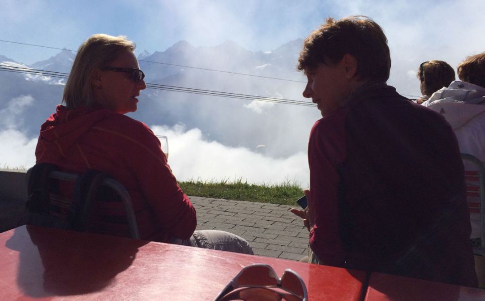 Samstag: Die elf teilnehmenden Turnerinnen trafen sich bei Traumwetter um 7:30 Uhr am Bahnhof Thalwil, ausgestattet mit Tagesrucksack und Rollkoffer. Mit vielen anderen Ausflüglern stiegen wir in den Zug nach Luzern ein. Dort angekommen, begann ein organisierter Umsteigemarathon, der Zug- und Busfahrten enthielt. Während der Zugfahrt gab es Gipfeli und sogar heissen Kaffee aus der handbetriebenen! Nespresso-Kaffeemaschine.