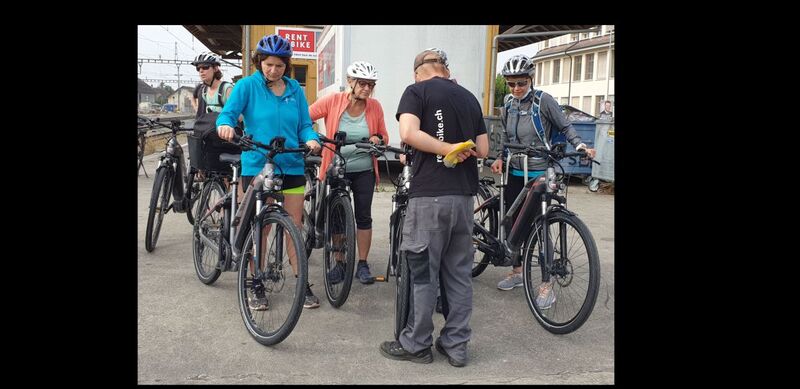 Ein paar Mal Umsteigen und ein Frühstück im Zug später stehen wir auf dem Bahnhof Murten. Die drei Fusstüchtigen (Erika, Karin und Marlyse) marschieren schon mal los, während der Rest (Nadine, Irene, Agi, Jacqueline, Barbara, Tamara, Corinne, Margit und ich) die Velos – mit und ohne Motor / Körbchen – fasst. Corinne und ich hoffen auf nicht zu viele Steigungen, während die anderen sich mit ihrer Turbo-Schaltung vertraut machen. Und dann geht es los.