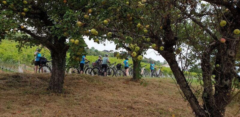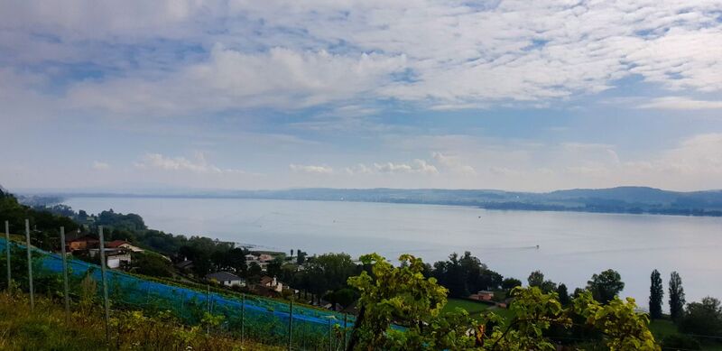 Murten, du musst warten, wir pedalen zuerst mal um den See! Nach ca. einer halben Stunde kommt dann tatsächlich bereits die erste befürchtete Steigung. Hoch in die Rebberge geht’s. Die mit den Turbo-Velos überholen mal flott... Aber hej, Corinne und ich sind nun gerade mal warm gefahren! Über die Reben von Pinot Gris, Chasselas, Chardonnay etc. belohnt uns eine wunderbare Aussicht auf den Murtensee. Entlang dem Hang geht’s weiter und – weil es so schön war – kommen gleich nochmals zwei Steigungen.