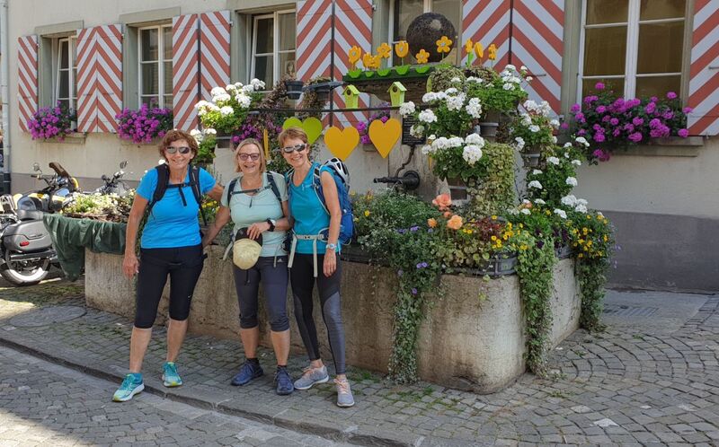 In Zürich stiegen wir in den Zug nach Schaffhausen um, wo wir unterhalb vom Munot in einer herzigen Bäckerei ein feines Morgenessen einnahmen. Das Gepäck hatten wir im Vorfeld am Bahnhof deponiert. Nachdem alle gesättigt und zufrieden waren, bestiegen wir den Bus über die deutsche Grenze nach Büsingen. Ein Dorf gänzlich vom Schweizer Hoheitsgebiet umgeben und bildet somit eine Enklave der Bundesrepublik. Unter kundiger Führung unserer Reiseleiterinnen konnten wir auf dem Enklavenweg ein wenig in die Geschichte von Büsingen eintauchen. Ein Erlebnispfad mit 8 Posten, wobei wir die Posten 1 -3 nur aus Corinnes ausführlichen Erzählungen erleben durften, da wir direkt bei Posten 4 einstiegen. Da die Karte schwierig zu lesen war – oder lag’s an unserer Führung? – kamen wir plötzlich in Zeitnot und mussten eine Abkürzung der Strasse entlang (diese wird uns übrigens noch ein paar Mal begleiten…) nehmen zum Schiffsteg nach Büsingen. Von dort ging es, bei strahlendem Wetter, mit dem Rheinschiff wieder zurück nach Schaffhausen und mit dem Gepäck weiter nach Hallau.