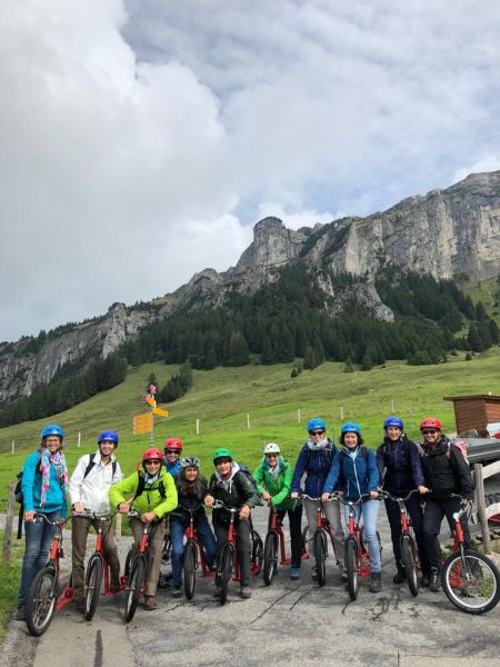 Die zwei bestens vorbereiteten Organisatorinnen Agi und Margit haben uns nichts ahnend ins Appenzell entführt. Schon die idyllische Zug- und Busfahrt dorthin mit Kaffeestop in Rapperswil hat uns in Ferienstimmung versetzt. Wir sind daraufhin über Hügel und an Seen, wo sich Esel und Katzen gute Nacht sagen, vorbei gewandert, mit den Trottis ins Tal gesaust, im Eventlokal Schnugge Bock nebst Säuen und Geissen im Familienschlafzimmer bei Gewitter verköstigt worden, wir haben gesungen (oder eher gejohlt?), gespielt, gekäffelet, Museum und Chilbi besucht, ein Konzert gegeben auf dem Landsgemeindeplatz und uns am Schluss noch ordentlich gewaschen im Heilbad Appenzell.
