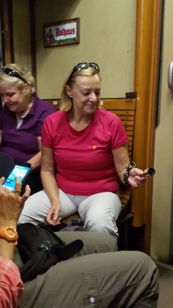 Wieder auf dem Zug Richtung Bern schläfert die Hitze die eine oder andere so richtig ein. Umso willkommener ist dann im Zug nach Olten/Zürich der von Agi und Nadine vorbereitete Apéro mit einem Gläschen Weisswein, welcher müde Geister wieder weckt.