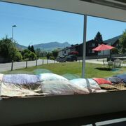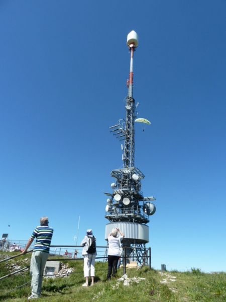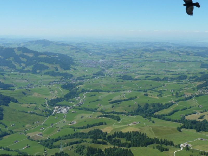 Nach dieser interessanten Besichtigung fahren wir nach Brülisau und schweben in 10 Minuten auf den Berg, der eben Hoher Kasten heisst. Im Drehrestaurant finden wir Platz und die Serviertochter fragt in ihrem Appenzeller Dialekt , was höond ihr gern strinka ? Bald schon stehen appetitliche und grosse Teller da und der Hunger von uns allen wird gestillt. Zwischendurch schauen wir aufs Panorama, auf den tief unten liegenden See, die Ebenalp und den Säntis und alle anderen Appenzeller Hügel. Bei diesem tollen Wetter sieht man den entfernten Bodensee, das St. Galler Rheintal, das Vorarlberg und die österreichischen Gipfel bis ins Montafon und zum Arlberg.